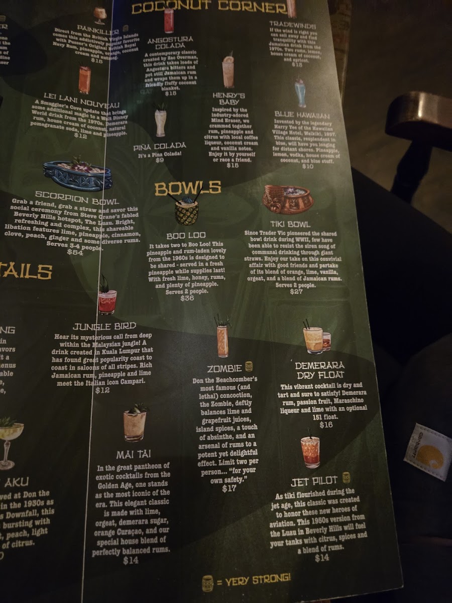 The drinks are equally impressive, with specialty options like the Zombie and Jet Pilot, crafted with care and lacking any watered-down notes. Guests have praised their experience, highlighting the attentive staff and welcoming vibe, perfect for both families and casual gatherings. Though the dim lighting adds to the ambiance, it's wise to bring a flashlight for first-timers.
